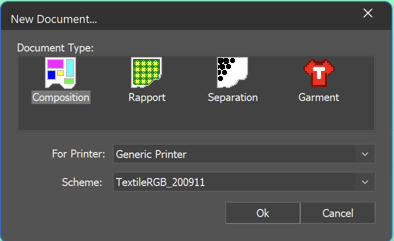 As mentioned at the start, neoStampa supports four different types of printing: Composition, Rapport, Separation and Garment. When you open a new document, a window opens with the option to select the job type.