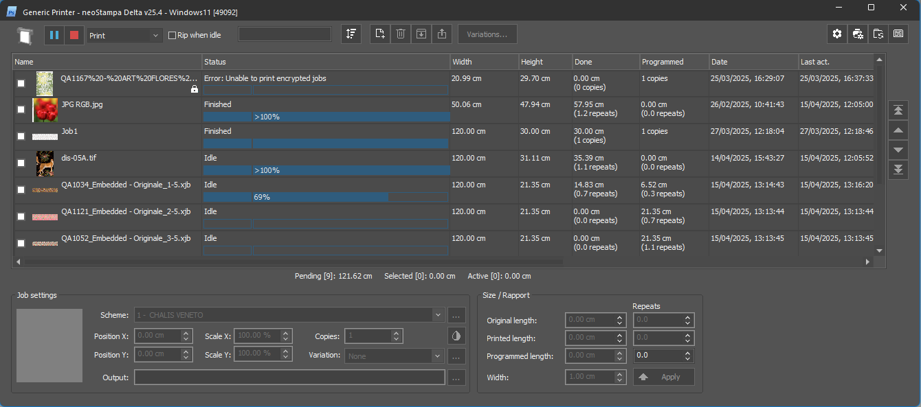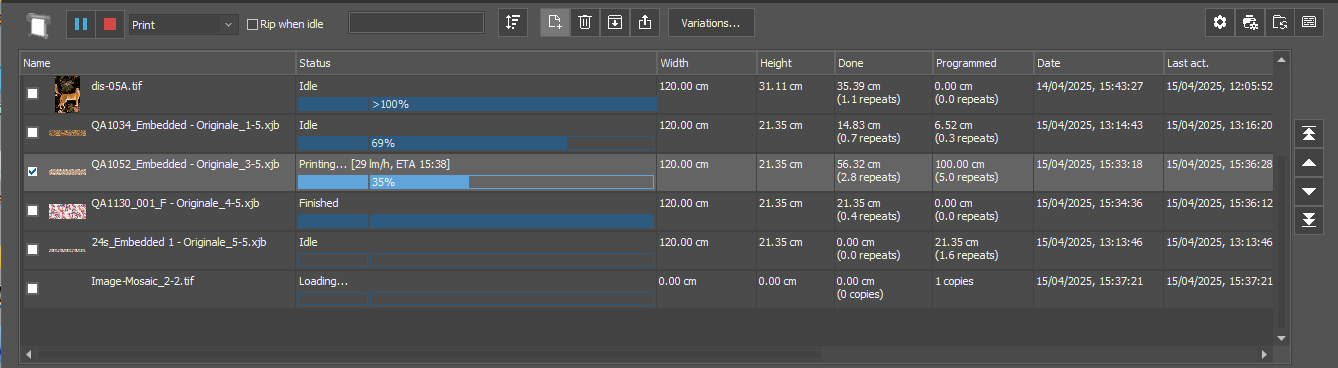 - When ticking the box or boxes (with multiple selections) of the print jobs in the printing queue, the ripping process starts, and in status shows the progress of every single print job.