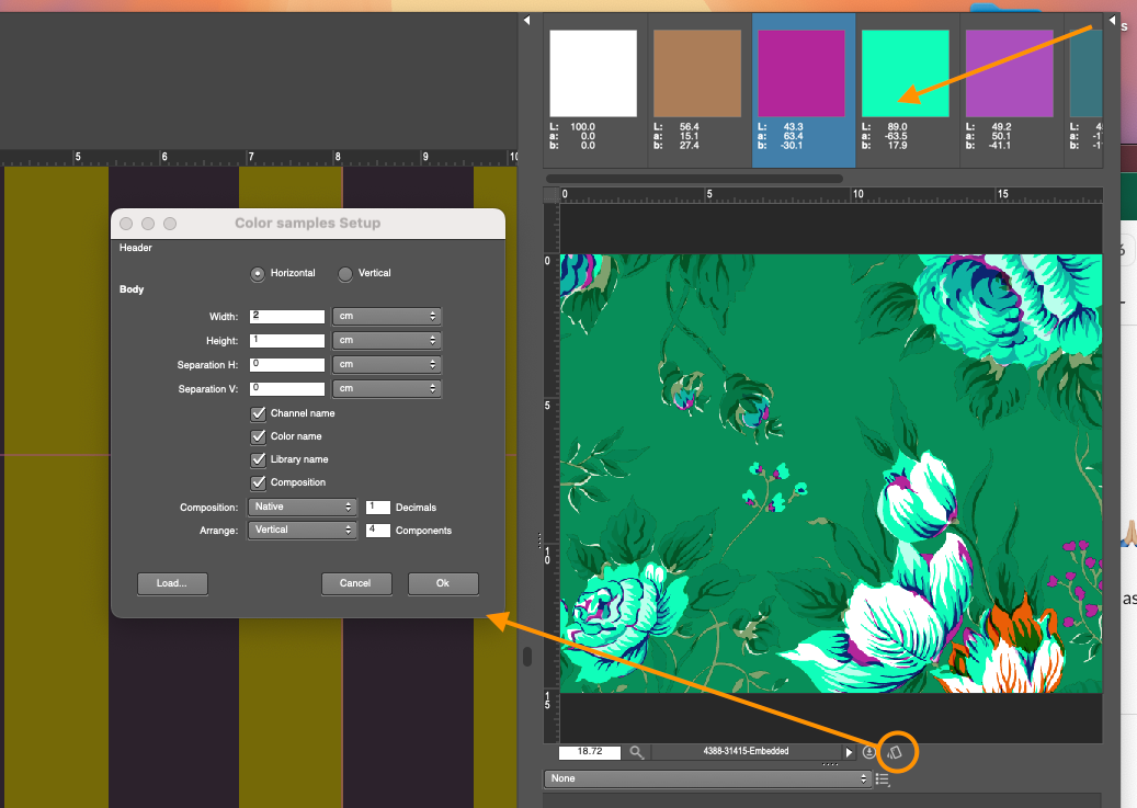 - Access a new 'Color Samples Setup' window via the 'Change Layouts' icon, allowing customization of the patches (e.g., set width and height) and display of color composition information.