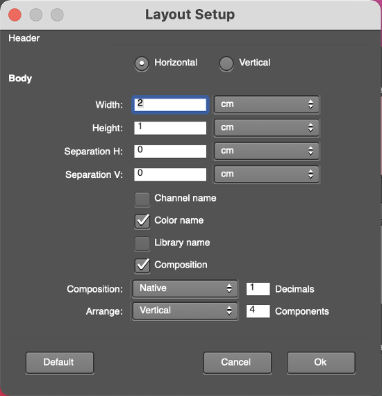 - The color composition decimals can be set from 0 to 3. The arrangement of composition can be horizontal or vertical.