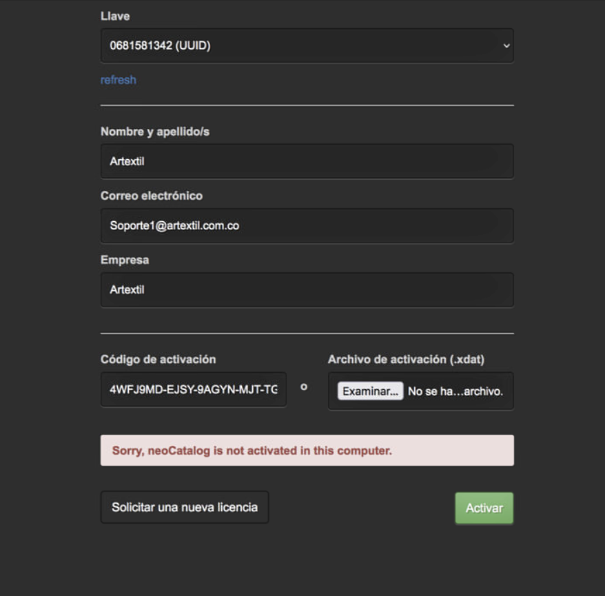 After uploading manually a new license XDAT or code in the neoCatalog activation manager, then the error message appears "Sorry, neoCatalog is not activated in this computer".