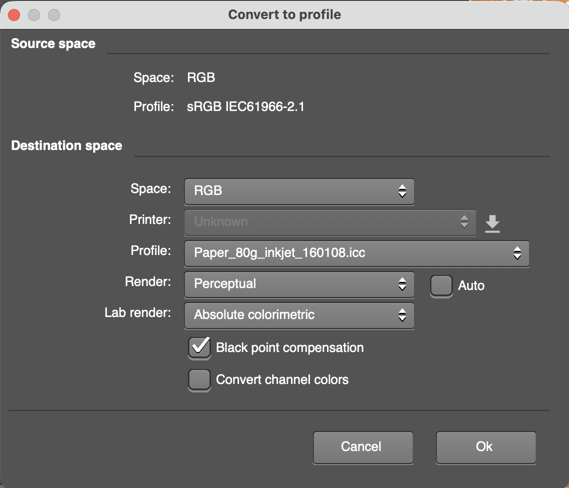 Asignar o convertir un colorido a un perfil ICC y guardar el perfil incrustado. nT Colorations ofrece varias opciones para aplicar modos de color y perfiles ICC instalados.