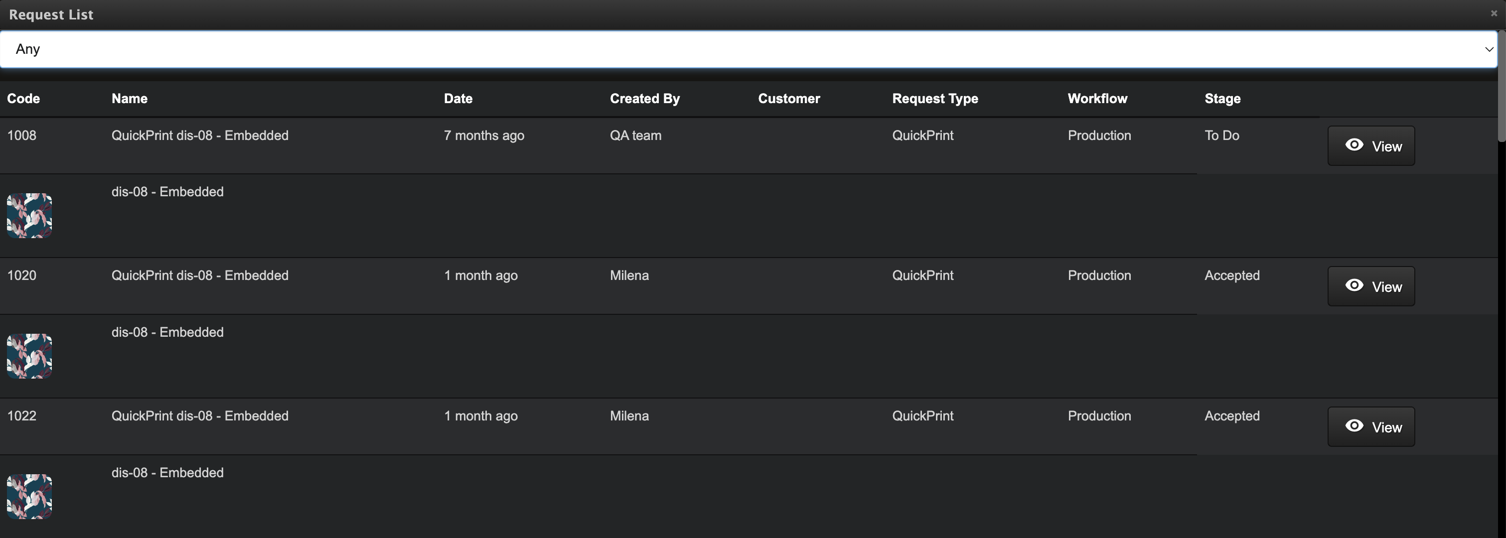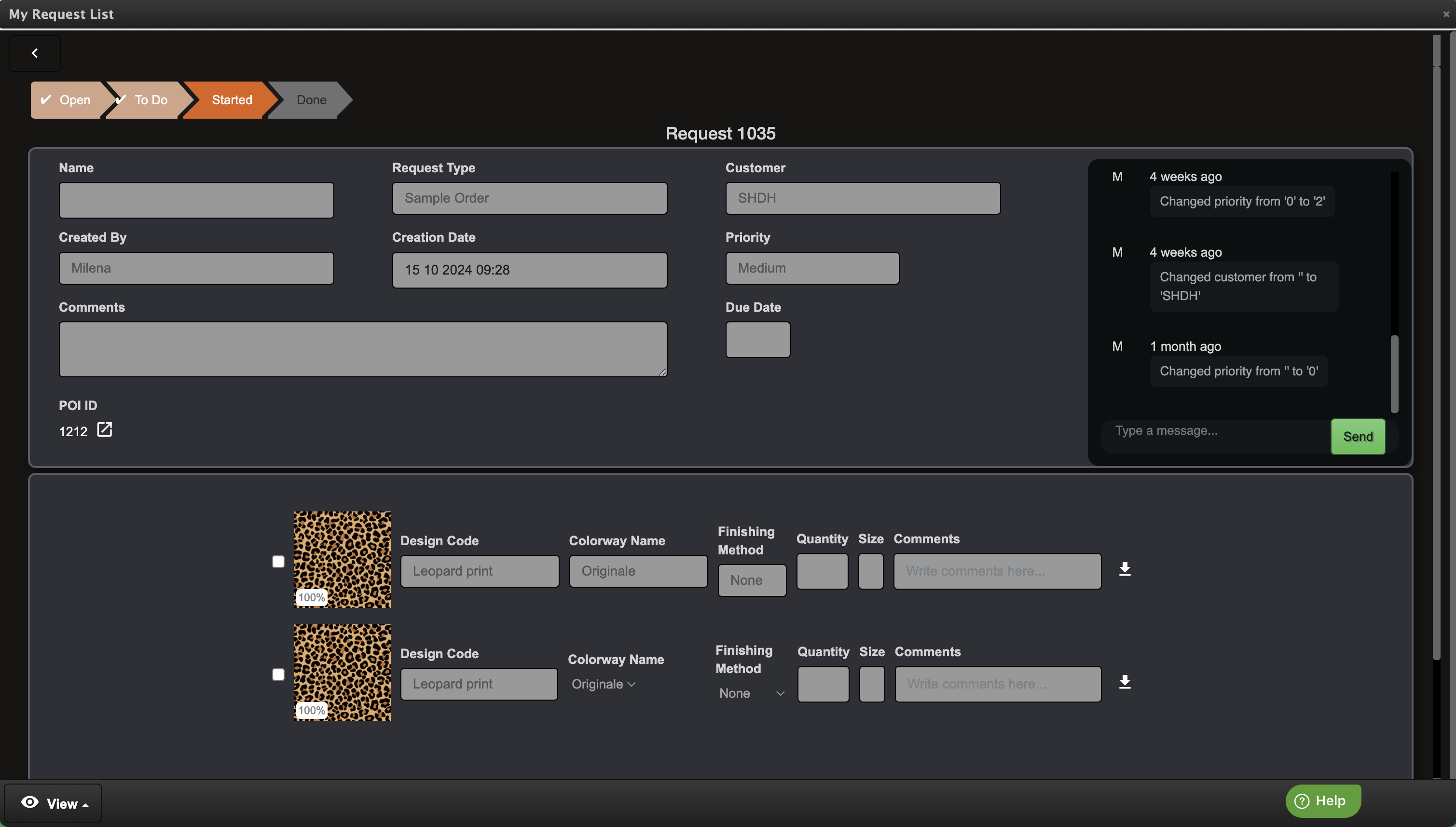 Haga clic en el botón (ojo) Ver junto a la solicitud en la lista para abrir los detalles de la solicitud. En esta vista, puede revisar los detalles del pedido y enviar mensajes por chat. Mediante el menú Ver de la parte inferior, puede añadir archivos adjuntos, especificar una dirección de entrega o ver el historial de actividad del pedido.