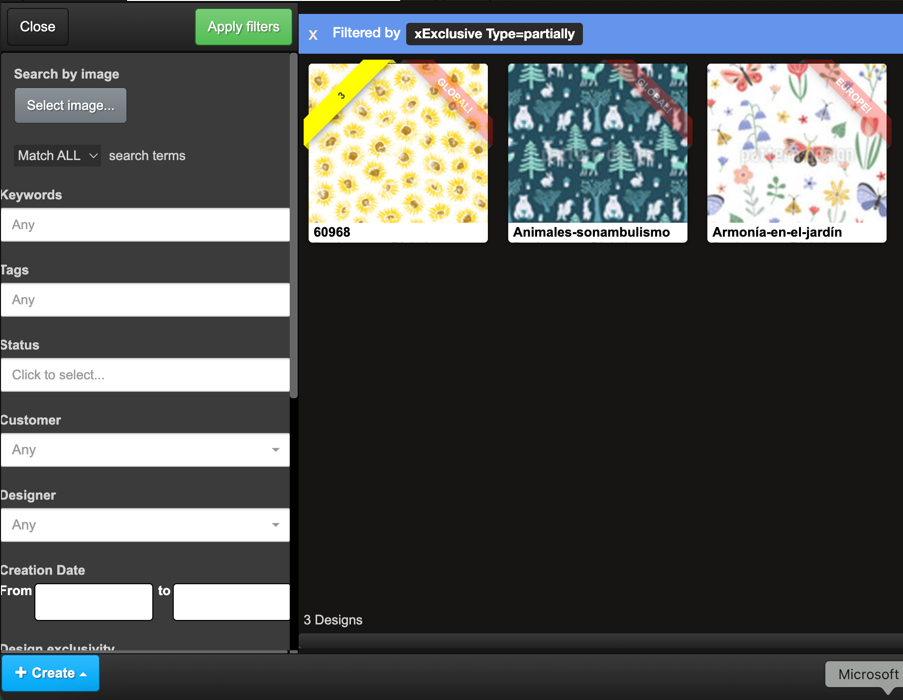 3. Busque el diseño exclusivo parcial mediante Búsqueda avanzada y los campos Cliente exclusivo, Zona y/o Tipo: