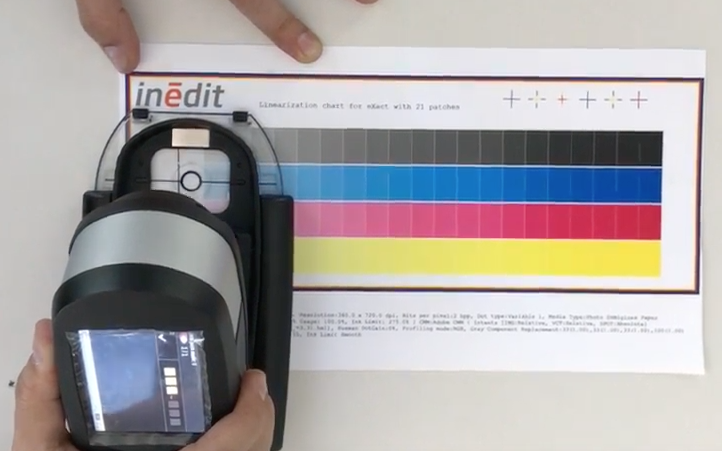 将定位尺和设备放置在介质上,位于参考图第 1 行第一个色块的上方。将设备降低到目标参考色基座上,并保持稳定直到测量完成。