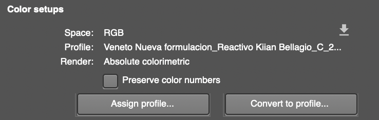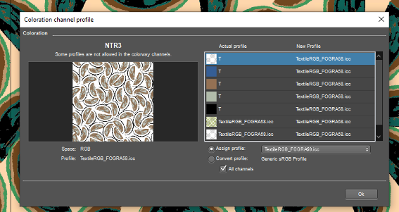 确认消息后,系统会向用户提示一个"指定色彩配置文件"窗口,用户可以在其中轻松地从下拉菜单中选择一个新的可用 ICC 色彩配置文件。