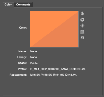 根据您选择的设置,颜色样本和图像将显示校样后的颜色。在窗口底部,显示嵌入(左侧)和校样(右侧)色彩配置文件。之后,当使用拾色器为配色设计着色时,校样将应用于色彩空间可视化中。