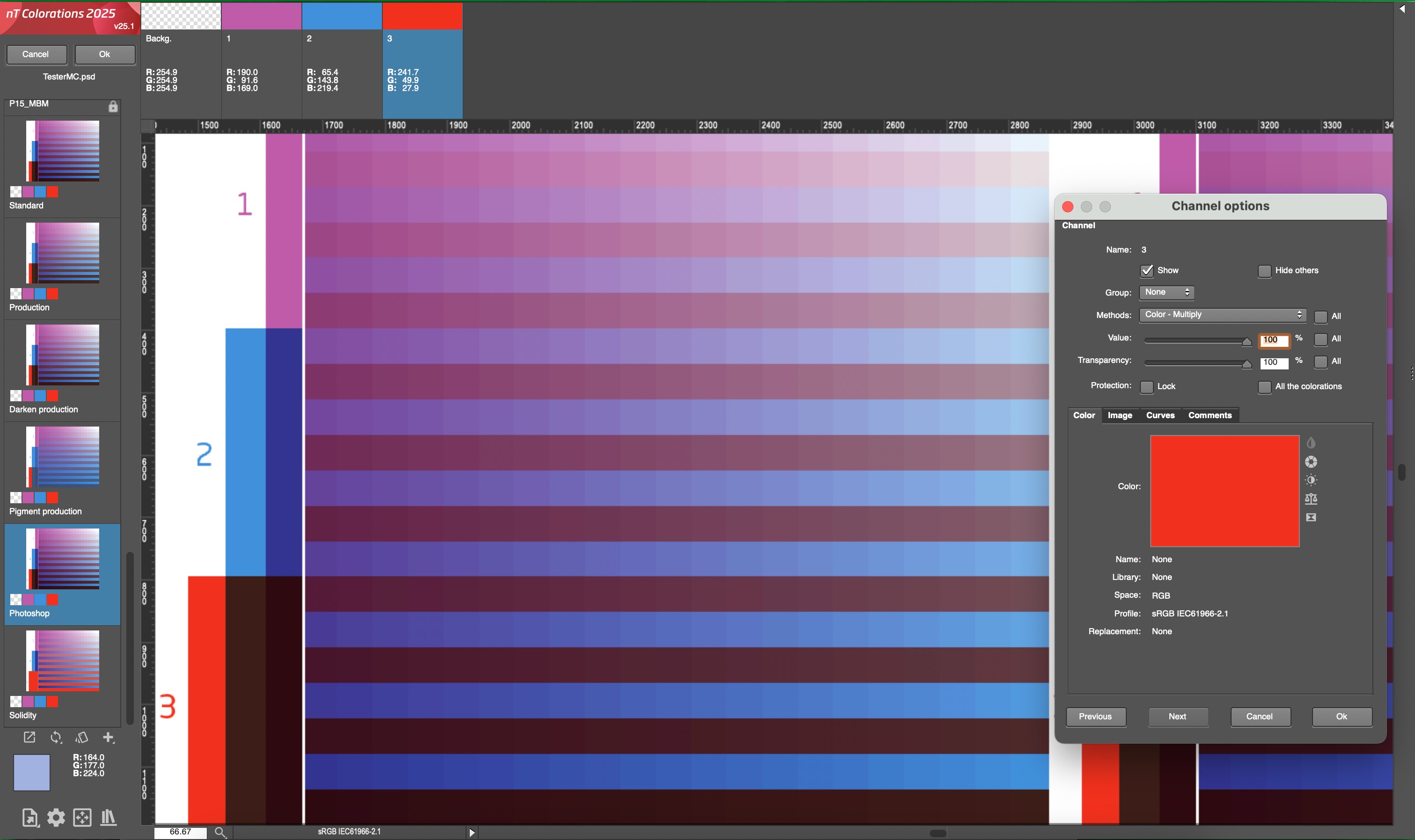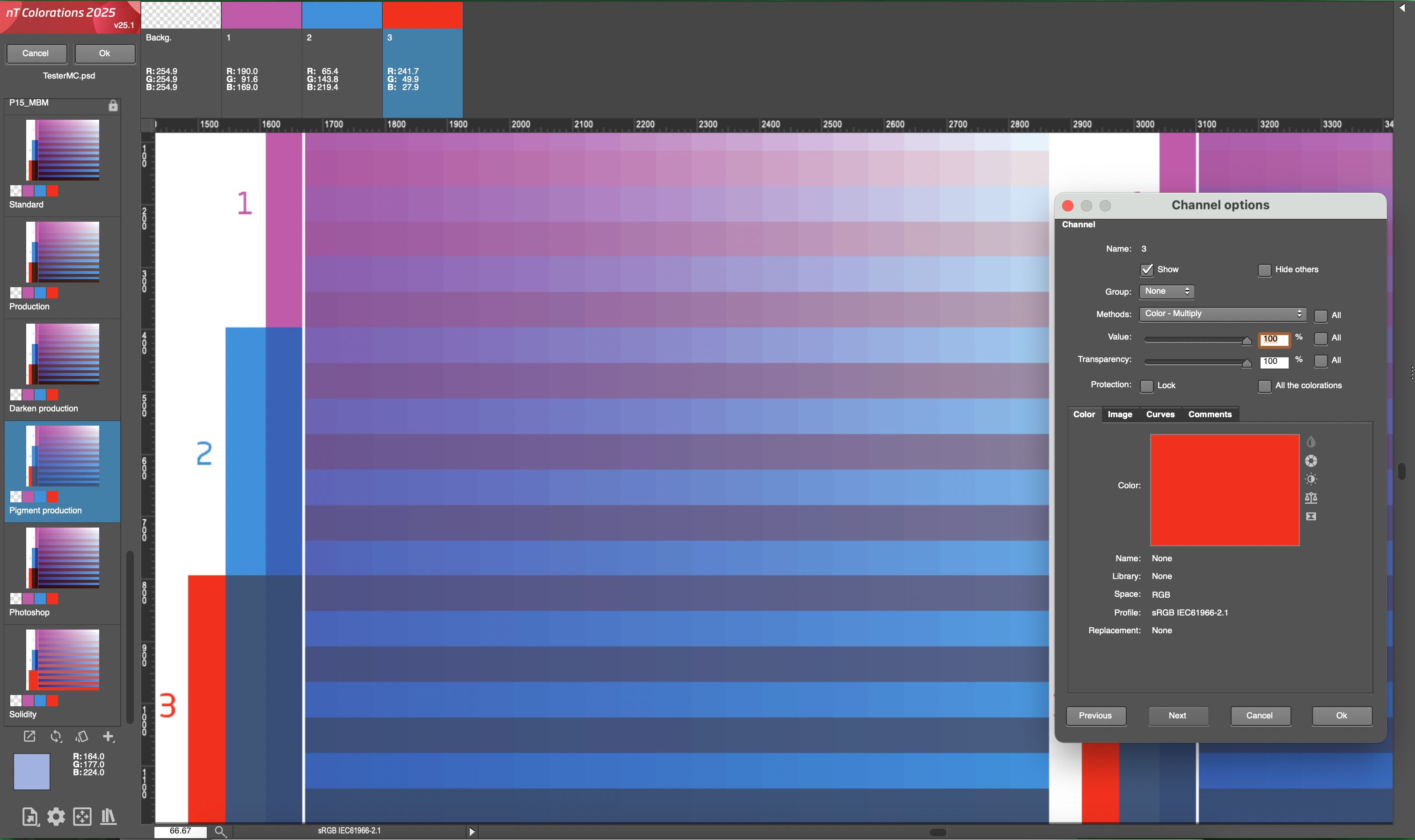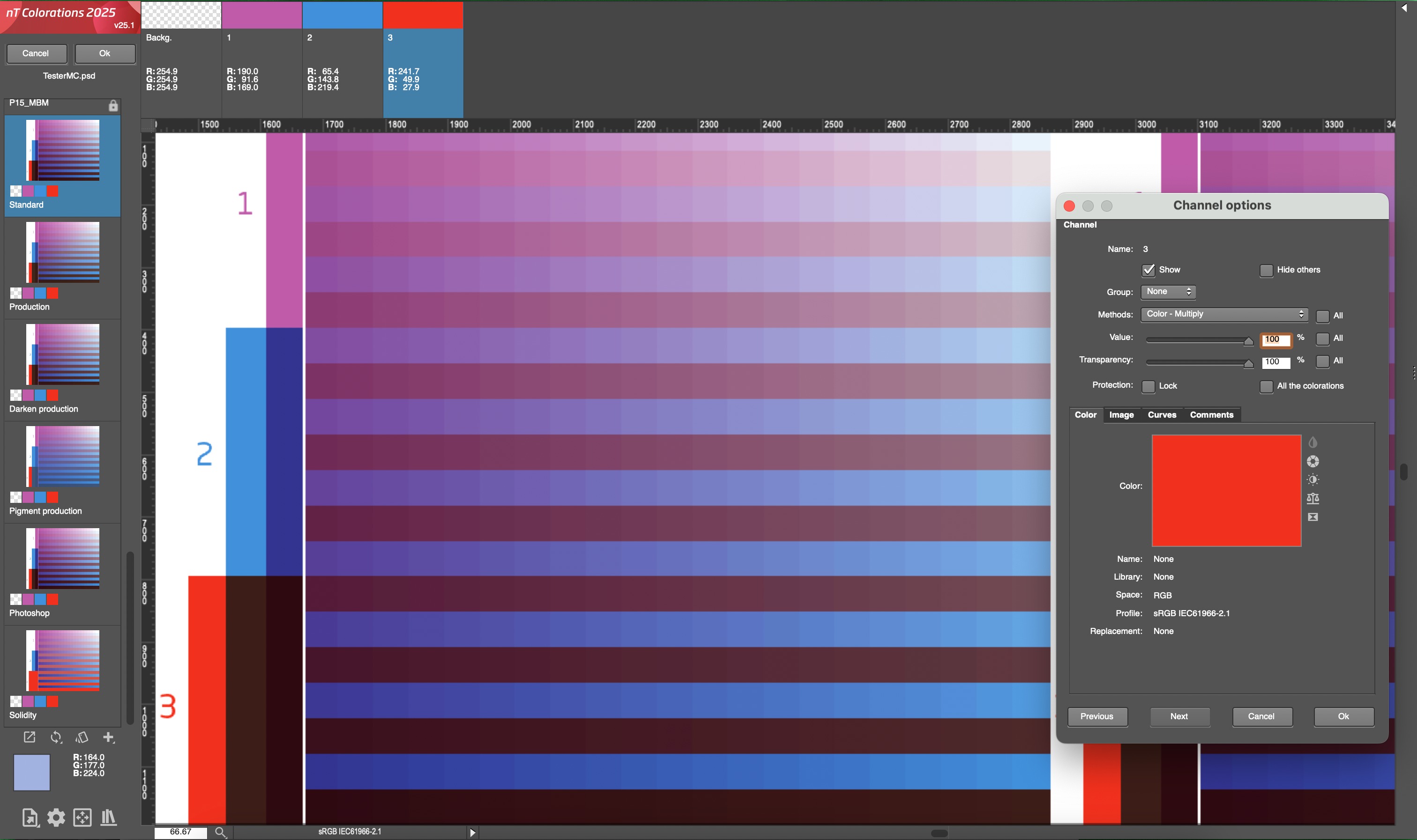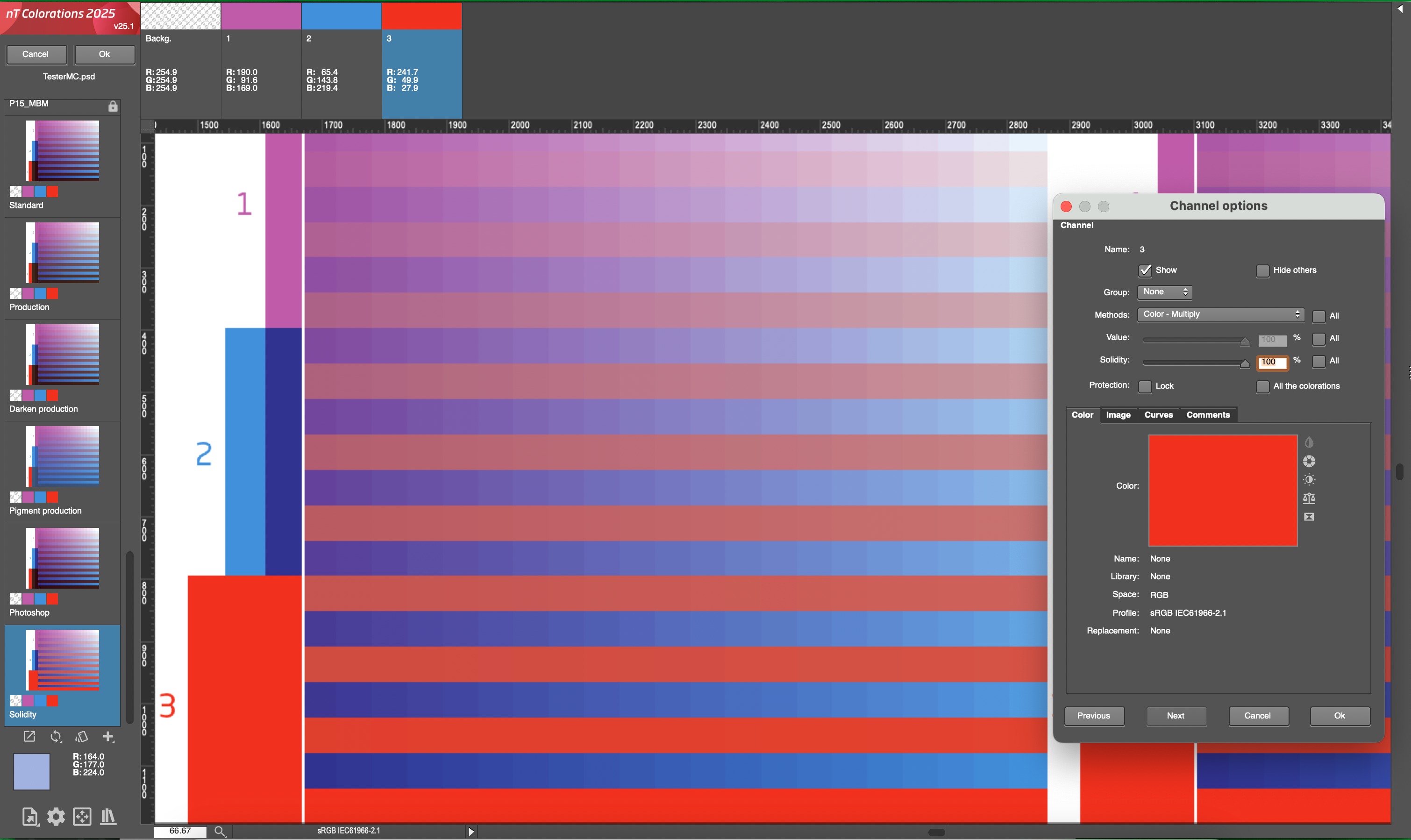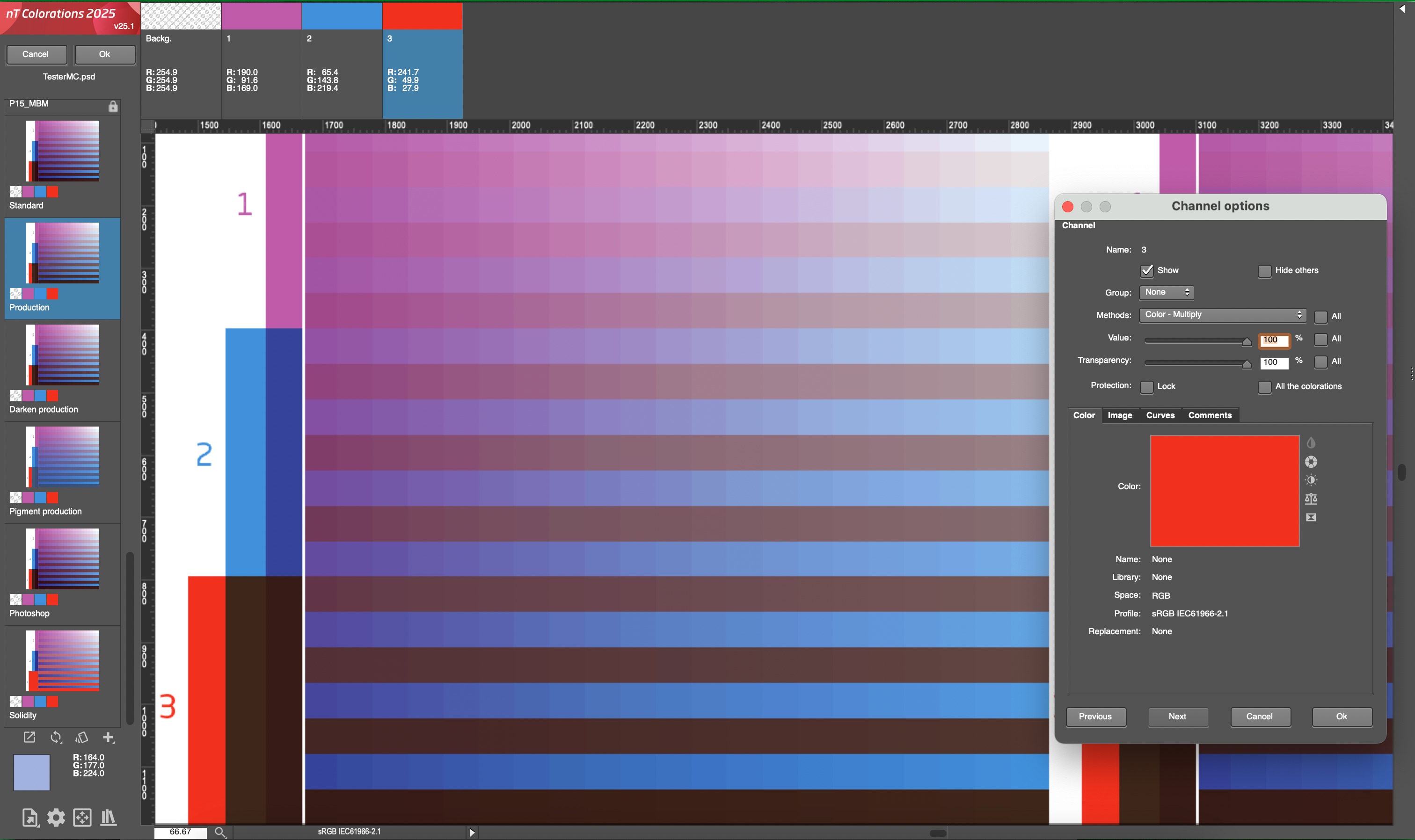 - 打印机配色设计:此系统允许直接在 nT 配色设计中使用颜色配方更改颜色通道,以绝对模式或相对模式为打印机设备墨水设置值,允许在墨水限制内拥有打印机渐变,以及管理特殊墨水,如荧光、助剂等,所有这些都在 nS 校准定义的工作流程内。习惯于在传统配色间中使用颜色配方的客户会发现,在他们的日常生产工作流程中修改和微调配色设计的颜色调整很容易。