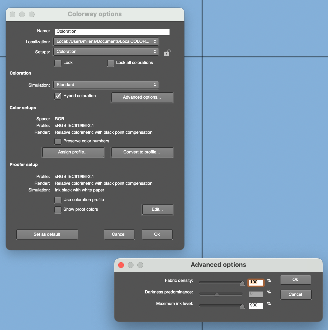 - 此选项用于命名您的配色设计并设置自动保存的位置。配色设计的本地化可以是本地或远程。本地本地化使用标准用户路径(Users//Documents/neoTextil/Colorations)。设置允许使用特定的设置名称保存不同的配置。