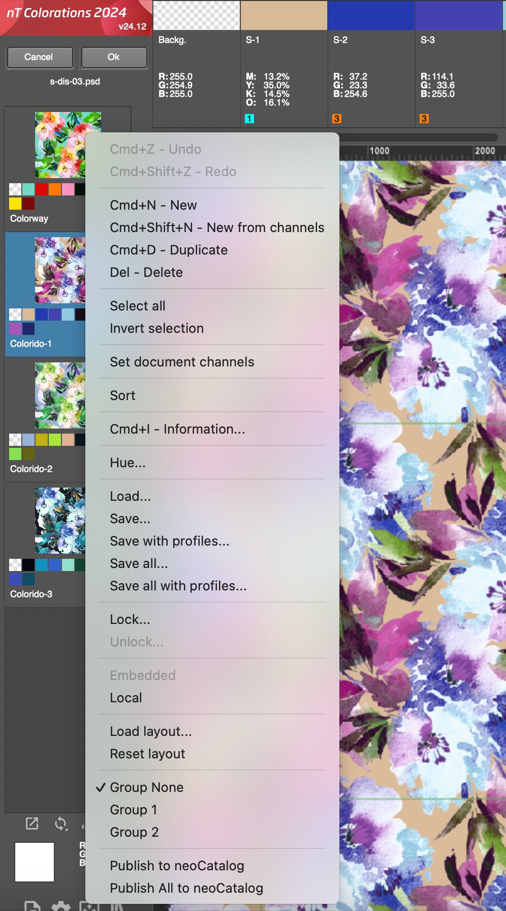 - 当在 Adobe® Photoshop® 中更改专色通道后,随后进入 nT Colorations 时,您可以根据专色通道,通过快捷菜单 (Cmd+Shift+N) 创建新的配色设计。
