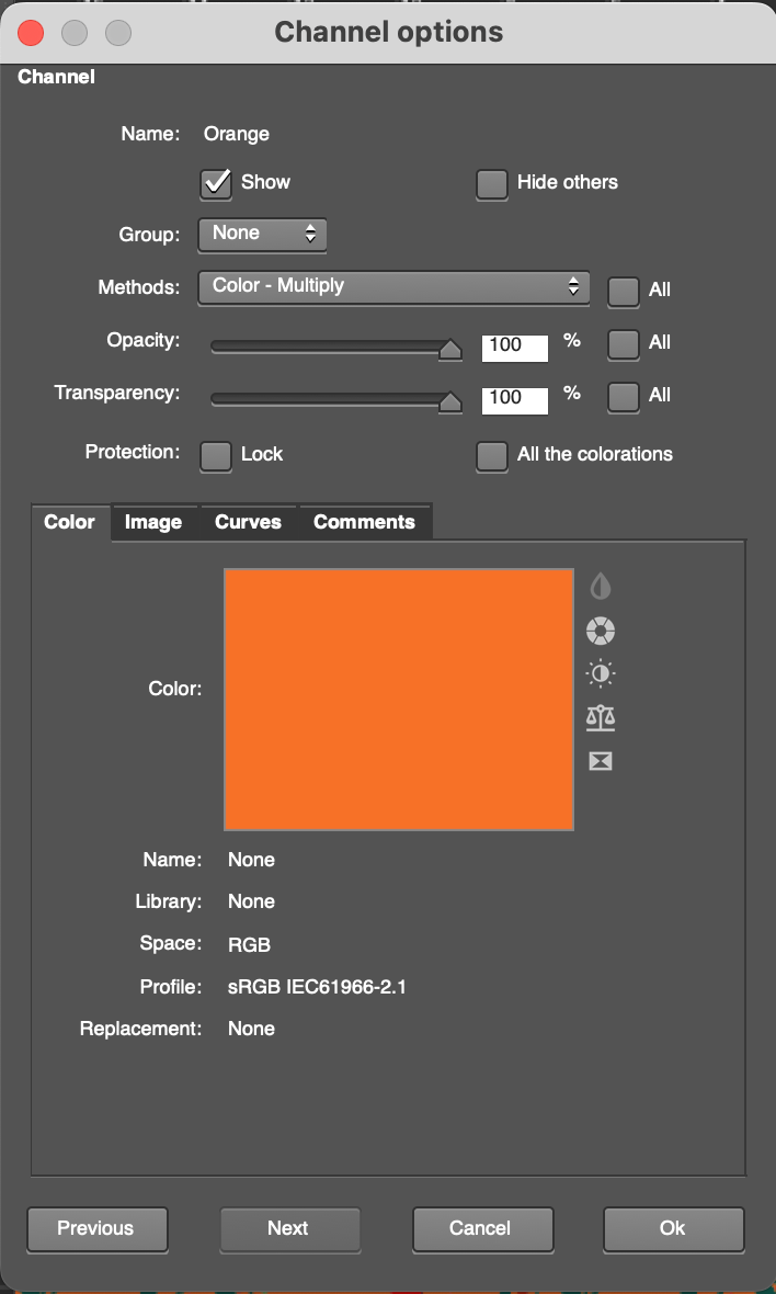 - 您可以通过将鼠标悬停在所选通道之一上并按住 Alt 键以灰度模式查看它们,并通过修改键(配合操作)来访问拾色器,例如在按住 Cmd 键的同时双击颜色通道。