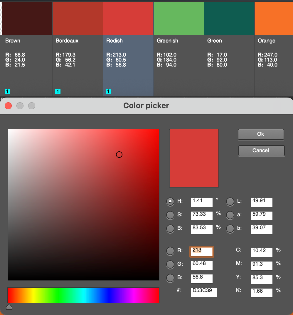 - 要交换两个分色的颜色,请按住 $t 键(Mac)或 Ctrl 键(PC),将颜色从一个分色拖到另一个分色上。交换颜色既可以在小预览图或大预览色块中进行。如果只想复制颜色,请将一种分色的颜色拖到另一种分色上,但这次请按住 Ctrl 键。