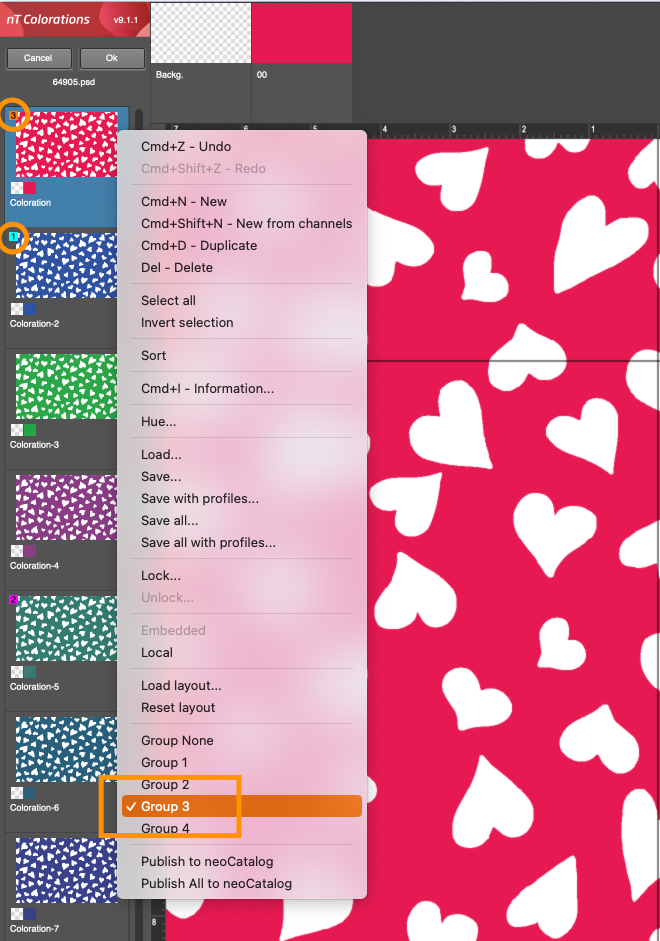 基于配色设计选择的快捷菜单中,您可以应用分组。第一个分组是 1,一旦有分组被使用,分组编号就会递增。分组数量的限制为 99 个。支持嵌入和本地配色设计。